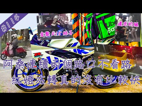 1.路人違規機車騎士好心停讓 2.逆向外送員 3.女騎士左轉未禮讓直行車 4.紅燈右轉 5.一個後照鏡不修一個後照鏡不裝 6.逆向 7.未戴安全帽 8.未戴安全帽