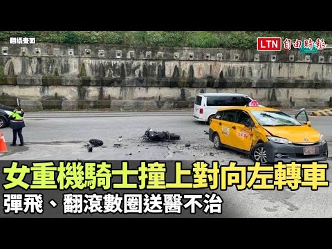 #違規左轉#不治#重機#彈飛 22歲女重機騎士撞上對向左轉計程車 彈飛、翻滾數圈送醫不治 https://news.ltn.com.tw/news/society/breakingnews/4562471 桃園市龜山區東萬壽路與龍校街32巷口發生死亡車禍,22歲林姓女子24日上午10點多,騎乘大型重機車往桃園方向直行,與53歲謬姓男子駕駛的計程車發生碰撞,當時謬男沿東萬壽路往新北市方向,正要由內側車道左轉龍校街,撞擊力道之猛,林女在空中翻滾數圈,人車倒地送醫搶救仍傷重不治。 ---------------------------------------------------- 我們的頻道➔ http://video.ltn.com.tw YouTube➔ https://www.youtube.com/user/tvforltn Dailymotion➔ https://www.dailymotion.com/LibertyTimes